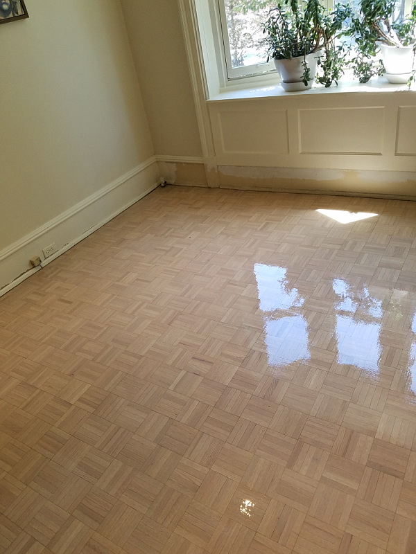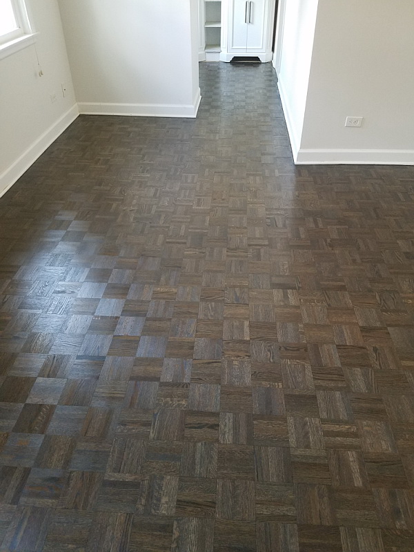 Traditionally, parquet is made from solid pieces of wood cut in a tongue and groove pattern so that they can be fitted together. Because the floor is solid all the way through, it can be sanded down and resurfaced as it degrades with age, and some floors will permit several refinishings before they need to be replaced